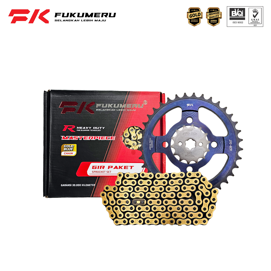 Gear Paket FUKUMERU dengan gir depan menggunakan bahan Alloy Steel 20CrMo dan gir belakang menggunakan bahan Alloy Steel 45#. Serta rantai roda menggunakan hardening steel 45# plat 2mm. Roll dan pin 20CrMo. Berperforma tinggi untuk sepeda motor saat ini.