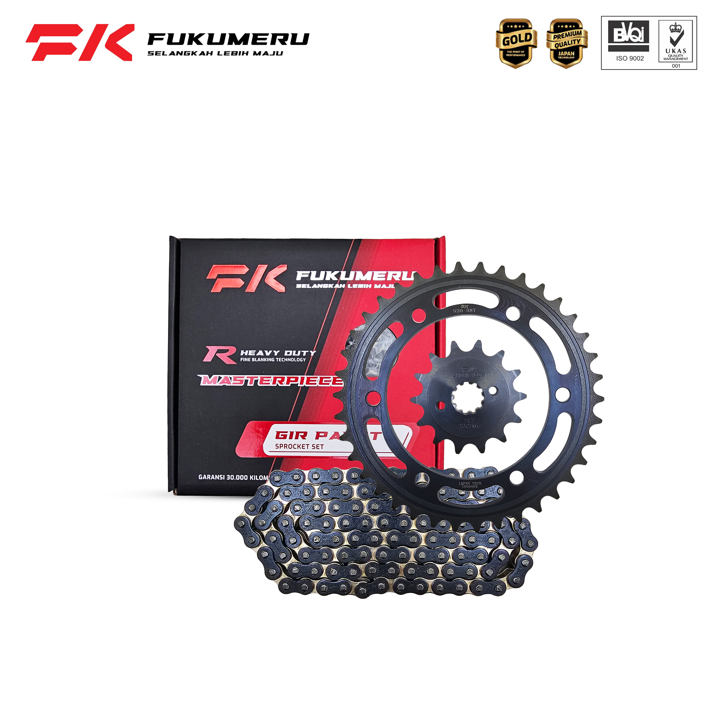 Gear Paket FUKUMERU dengan gir depan menggunakan bahan Alloy Steel 20CrMo dan gir belakang menggunakan bahan Alloy Steel 45#. Serta rantai roda menggunakan hardening steel 45# plat 2mm. Roll dan pin 20CrMo. Berperforma tinggi untuk sepeda motor saat ini.
