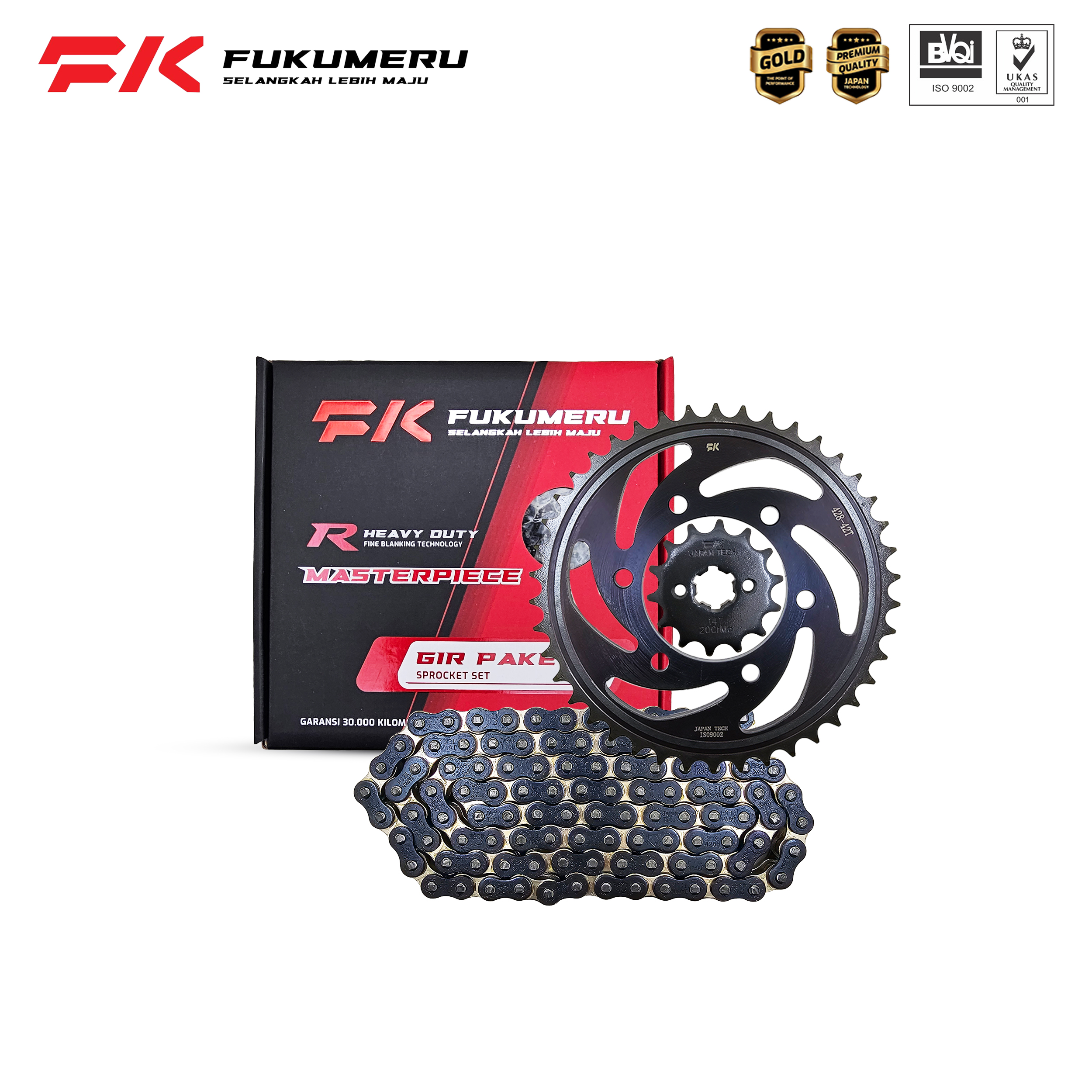 Gear Paket FUKUMERU dengan gir depan menggunakan bahan Alloy Steel 20CrMo dan gir belakang menggunakan bahan Alloy Steel 45#. Serta rantai roda menggunakan hardening steel 45# plat 2mm. Roll dan pin 20CrMo. Berperforma tinggi untuk sepeda motor saat ini.