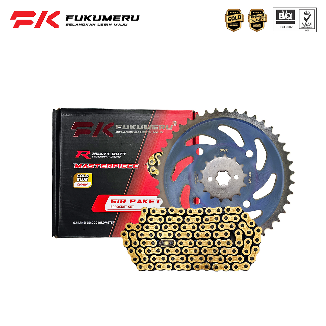 Gear Paket FUKUMERU dengan gir depan menggunakan bahan Alloy Steel 20CrMo dan gir belakang menggunakan bahan Alloy Steel 45#. Serta rantai roda menggunakan hardening steel 45# plat 2mm. Roll dan pin 20CrMo. Berperforma tinggi untuk sepeda motor saat ini.